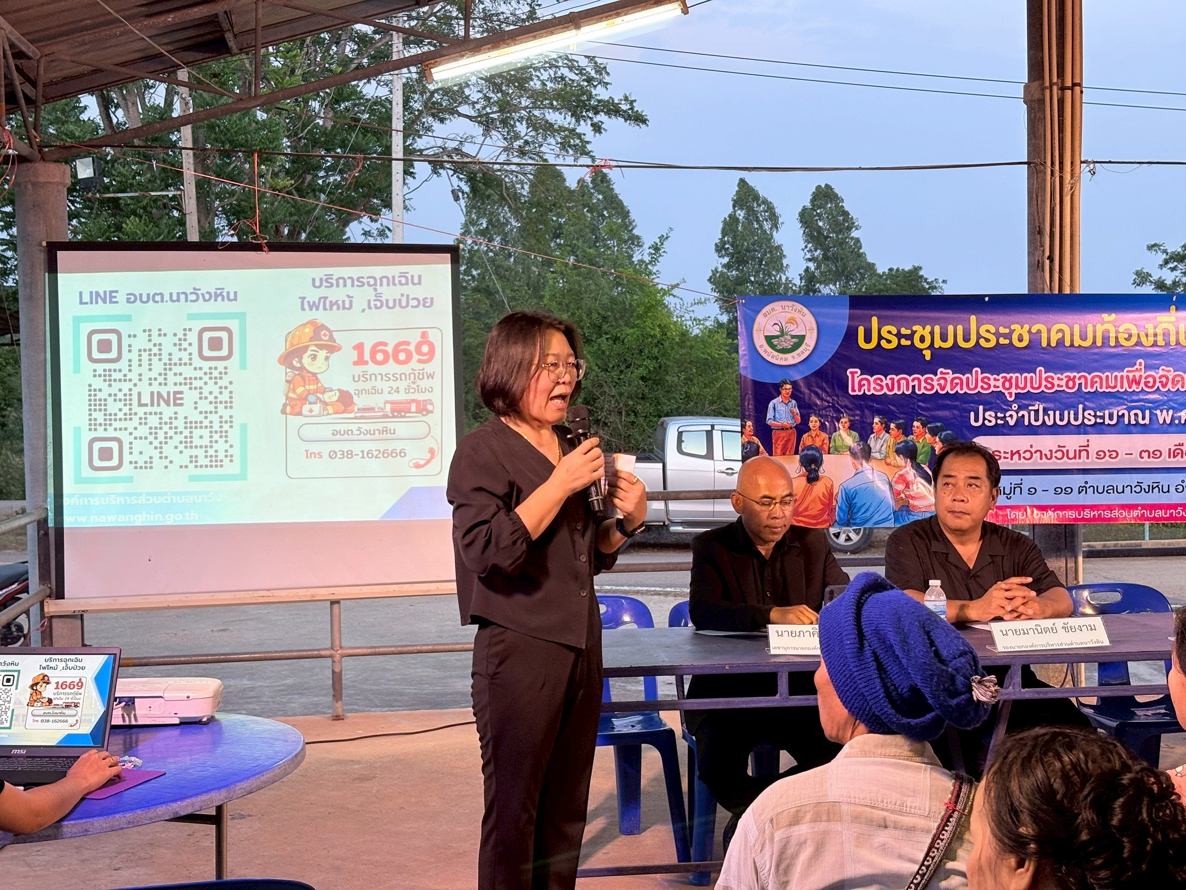 นายมานพ ศรีนวล นายกองค์การบริหารส่วนตำบลนาวังหิน (ประธานคณะกรรมการพัฒนาองค์การบริหารส่วนตำบลนาวังหิน) ,นางณัฐชนิกา คำสิงห์ กำนันตำบลนาวังหิน (ประธานประชาคม) ,นางสาวลิปิการ์ ศรีนวล ประธานสภาองค์การบริหารส่วนตำบลนาวังหิน ,นายสวรรค์ บุญทา สมาชิกสภาองค์การบริหารส่วนตำบลนาวังหิน หมู่ที่ 4 พร้อมด้วย คณะผู้บริหาร เจ้าหน้าที่ อบต.นาวังหิน ประชาชนหมู่ที่ 4 ร่วมการประชาคมระดับหมู่บ้านระดับตำบล เพื่อจัดทำแผนพัฒนาท้องถิ่น ประจำปีงบประมาณ พ.ศ. 2569 พร้อมรับชำระภาษีและค่าธรรมเนียมต่างๆนอกสถานที่ ณ ศาลาฝายคลองม่วง หมู่ที่ 4 บ้านอีโค้ ตำบลนาวังหิน อำเภอพนัสนิคม จังหวัดชลบุรี