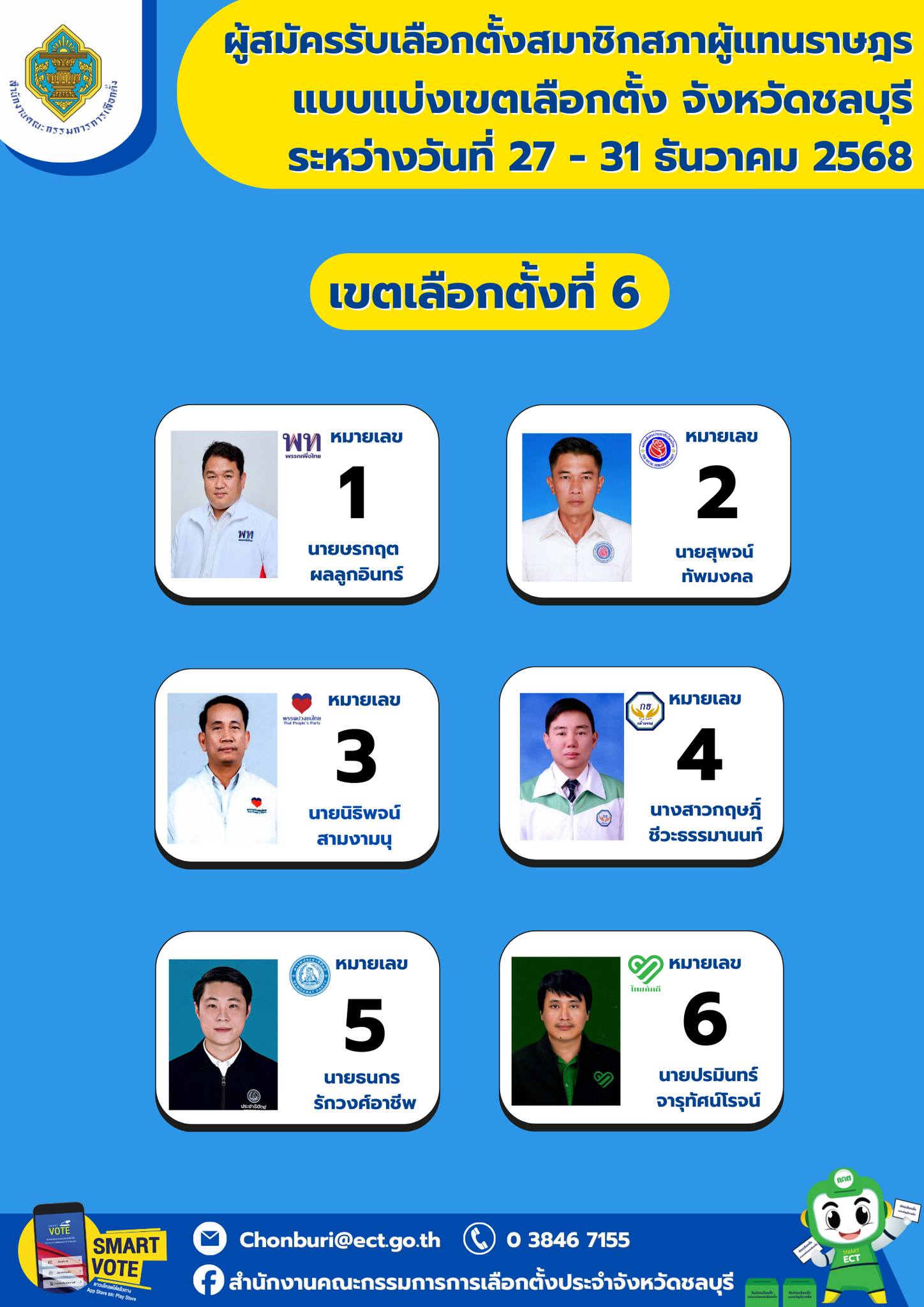 ผู้สมัครรับเลือกตั้งสมาชิกสภาผู้แทนราษฎรแบบแบ่งเขตเลือกตั้ง เขตเลือกตั้งที่ 1 - 10 จังหวัดชลบุรี