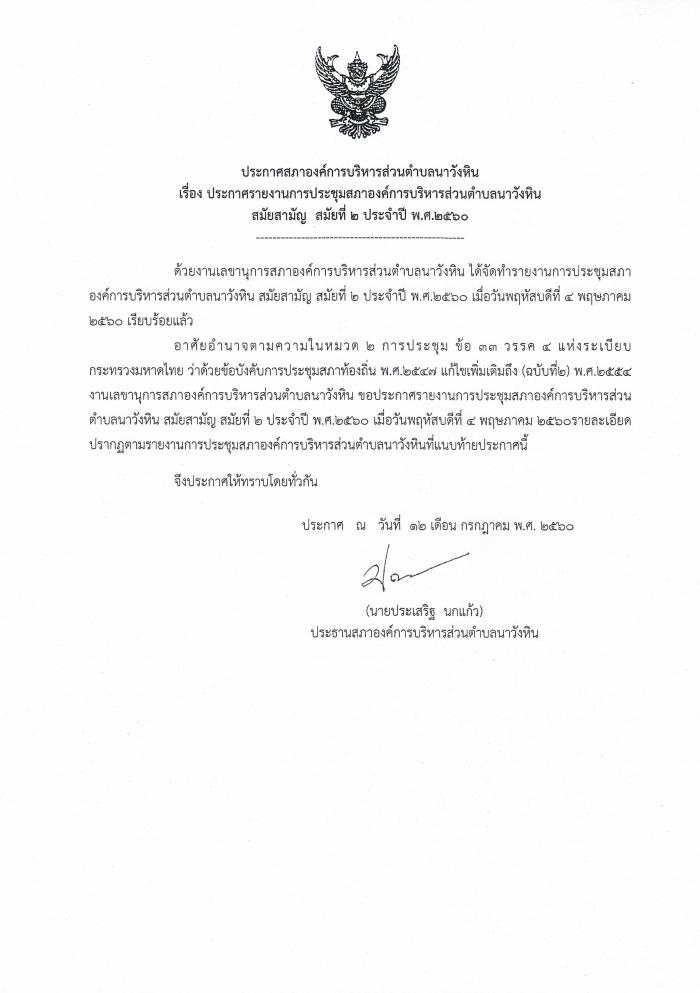 ประกาศรายงานการประชุมสภาสมัยวิสามัญ สมัยที่ 2 ครั้งที่ 1 เมื่อวันพุธที่ 12 กรกฎาคม 2560