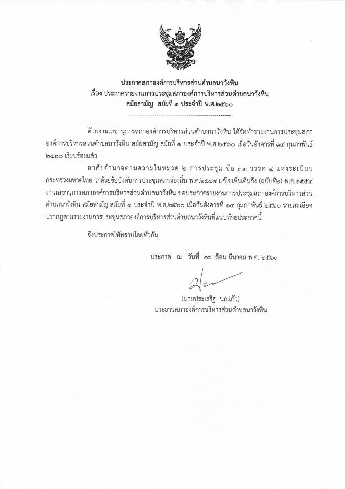 ประกาศองค์การบริหารส่วนตำบลนาวังหิน เรื่องการกำหนดสมัยประชุมสามัญ สมัยแรก ประจำปี 2565