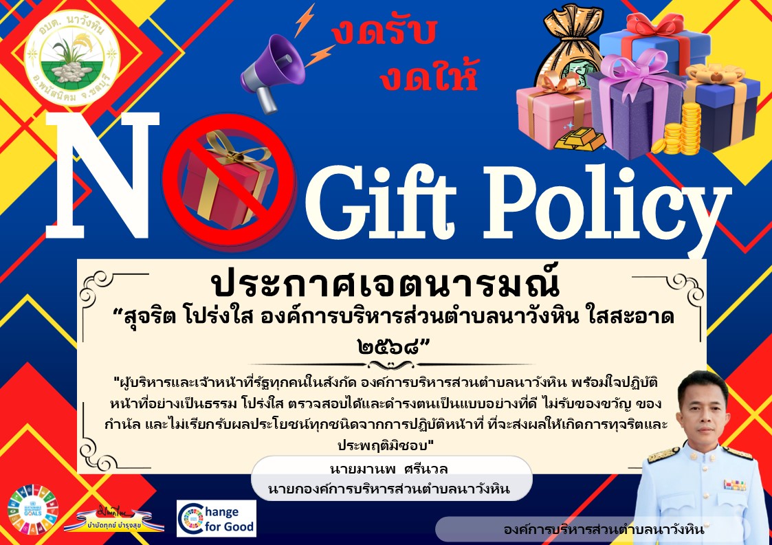 “สุจริต โปร่งใส องค์การบริหารส่วนตำบลนาวังหิน ใสสะอาด 2568” และ “งดรับ งดให้” ของขวัญ ของกำนัลทุกชนิดจากการปฏิบัติหน้าที่ (No Gift Policy) (10 เม.ย. 2568 )