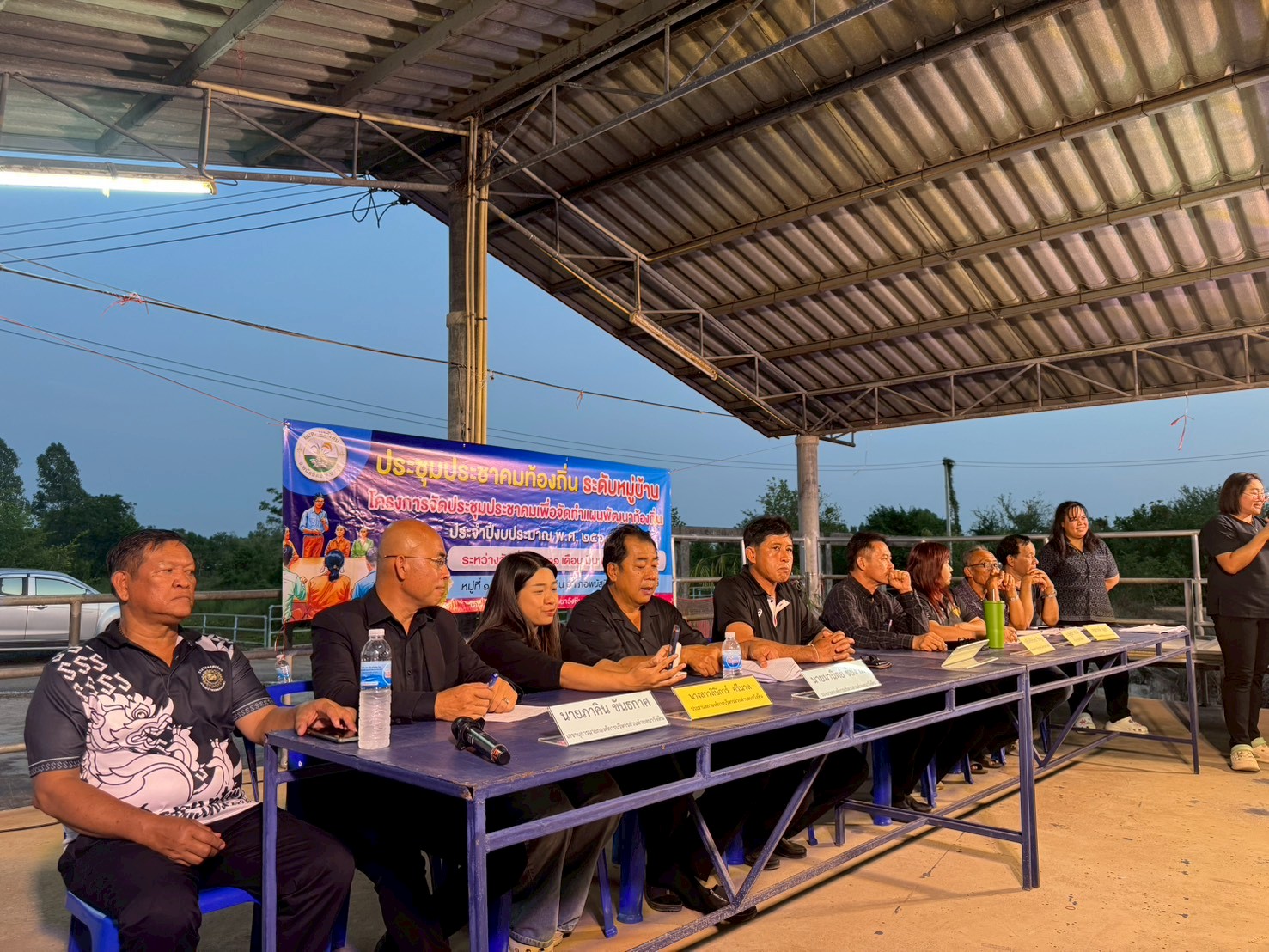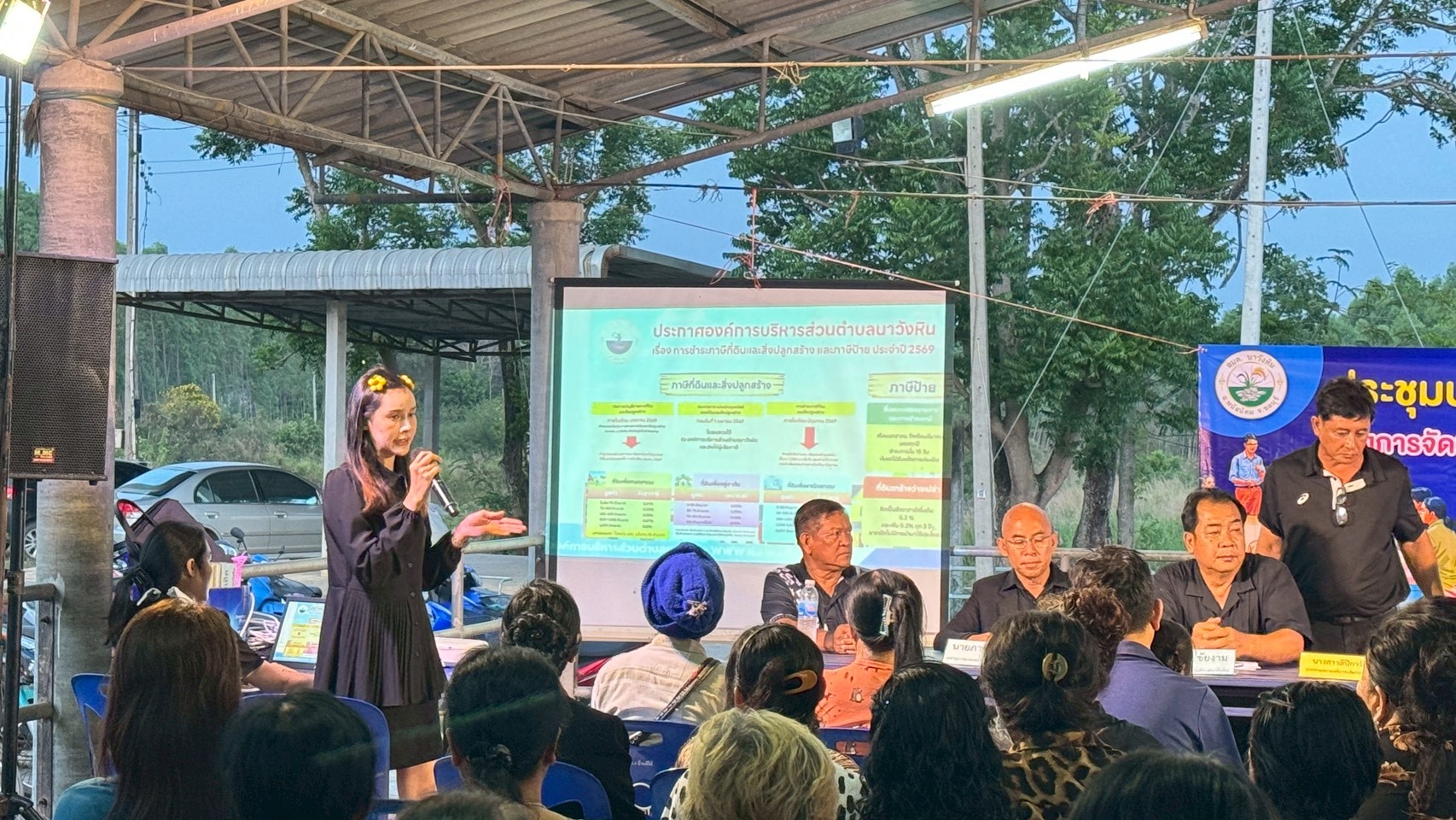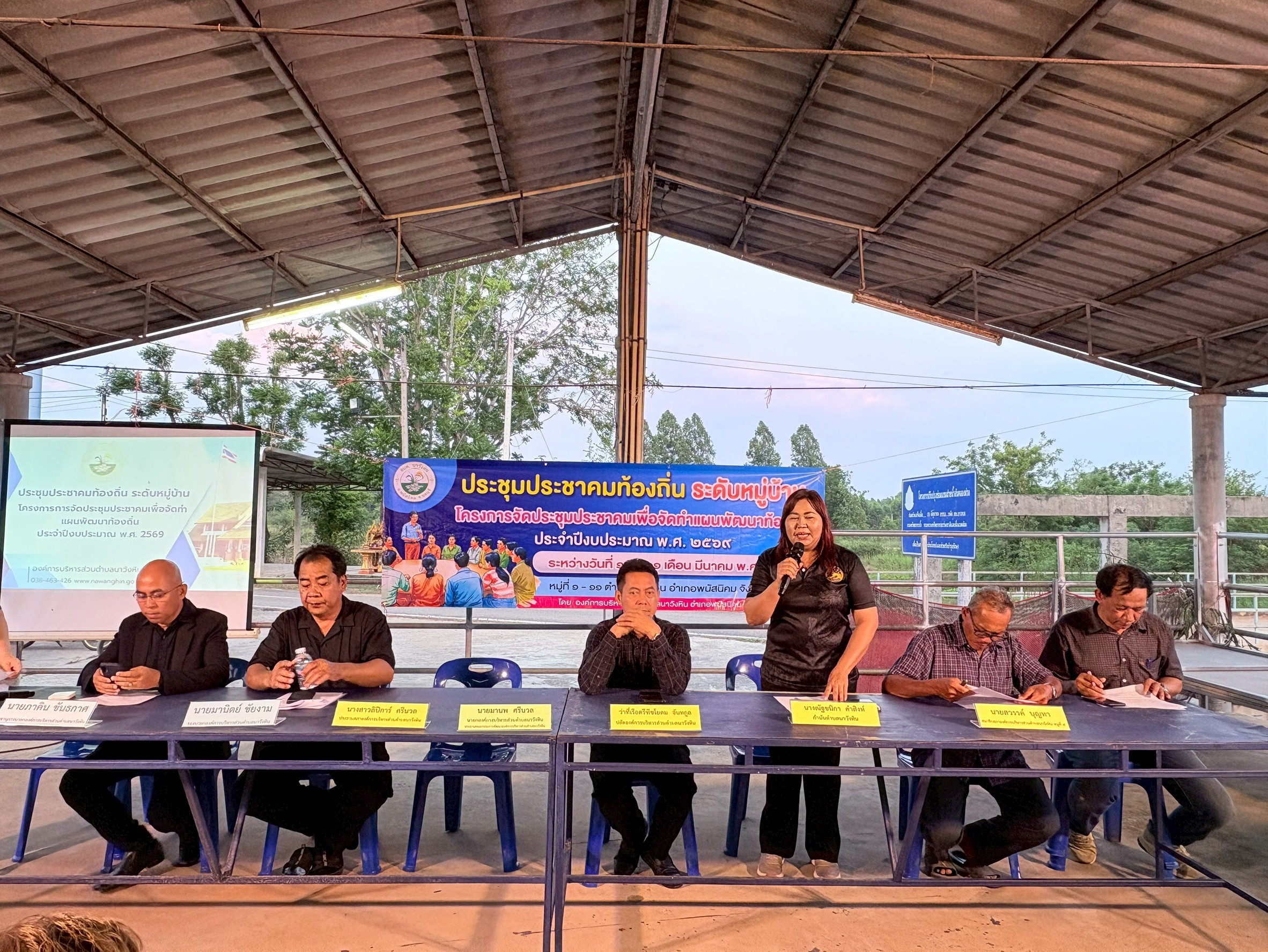 นายมานพ ศรีนวล นายกองค์การบริหารส่วนตำบลนาวังหิน (ประธานคณะกรรมการพัฒนาองค์การบริหารส่วนตำบลนาวังหิน) ,นางณัฐชนิกา คำสิงห์ กำนันตำบลนาวังหิน (ประธานประชาคม) ,นางสาวลิปิการ์ ศรีนวล ประธานสภาองค์การบริหารส่วนตำบลนาวังหิน ,นายสวรรค์ บุญทา สมาชิกสภาองค์การบริหารส่วนตำบลนาวังหิน หมู่ที่ 4 พร้อมด้วย คณะผู้บริหาร เจ้าหน้าที่ อบต.นาวังหิน ประชาชนหมู่ที่ 4 ร่วมการประชาคมระดับหมู่บ้านระดับตำบล เพื่อจัดทำแผนพัฒนาท้องถิ่น ประจำปีงบประมาณ พ.ศ. 2569 พร้อมรับชำระภาษีและค่าธรรมเนียมต่างๆนอกสถานที่ ณ ศาลาฝายคลองม่วง หมู่ที่ 4 บ้านอีโค้ ตำบลนาวังหิน อำเภอพนัสนิคม จังหวัดชลบุรี