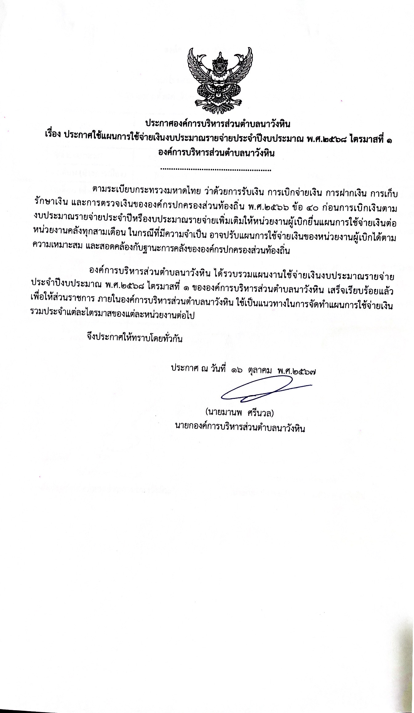 ประกาศแผนการใช้จ่ายเงินงบประมาณ 2568 ไตรมาสที่ 1