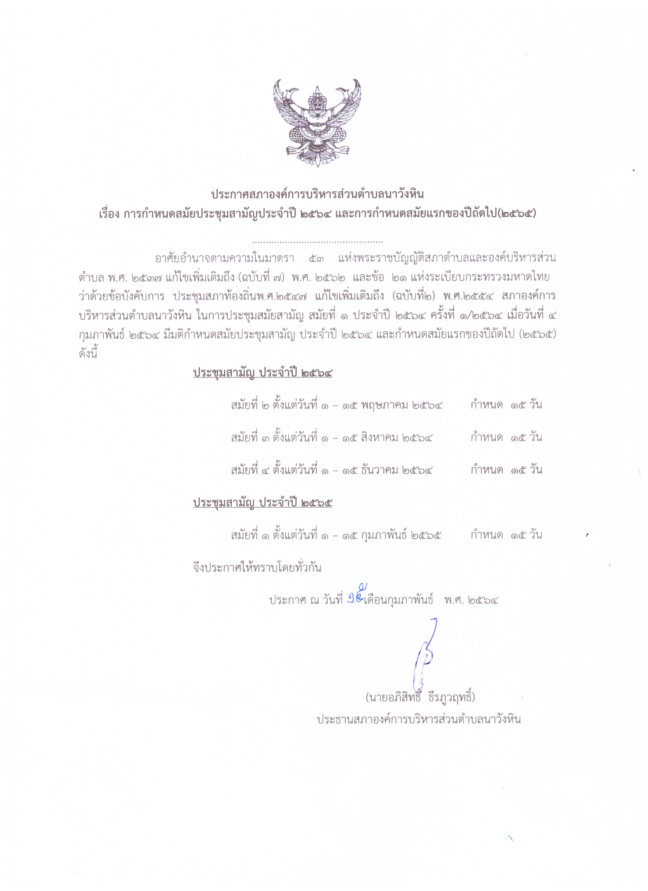 ประกาศองค์การบริหารส่วนตำบลนาวังหิน เรื่องการกำหนดสมัยประชุมสามัญประจำปี 2565 และการกำหนดสมัยแรกของปีถัดไป (2566)