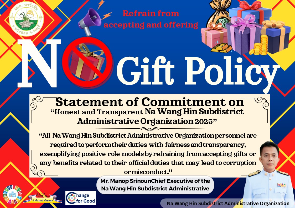 “สุจริต โปร่งใส องค์การบริหารส่วนตำบลนาวังหิน ใสสะอาด 2568” และ “งดรับ งดให้” ของขวัญ ของกำนัลทุกชนิดจากการปฏิบัติหน้าที่ (No Gift Policy) (10 เม.ย. 2568 )